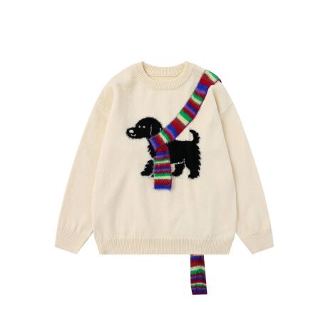 立体的な“カラフルボーダーマフラー”と、ふわふわ質感で編み込まれた“わんちゃんモチーフ”が特徴的な遊び心あふれるニットセーター。