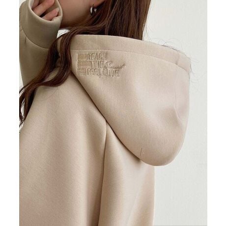 フードにはこだわりの刺繍ロゴをあしらい、シンプルな中にもアクセントをプラスしています。