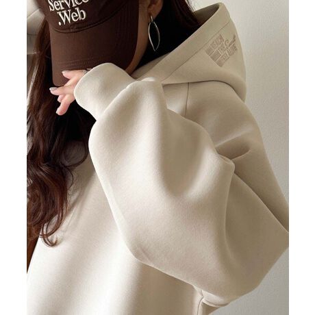 フードにはこだわりの刺繍ロゴをあしらい、シンプルな中にもアクセントをプラスしています。