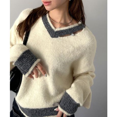 ふんわりとした起毛感が特徴の配色Vネックニットプルオーバー。