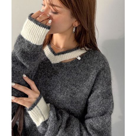 ふんわりとした起毛感が特徴の配色Vネックニットプルオーバー。