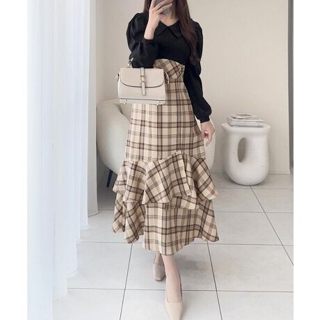 ハイウエストで切り替えたチェック柄のスカートは、