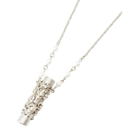 胸元に繊細な華やぎを添える、デコラティブなペンダントネックレス。円柱状のトップには精巧な透かし彫りとビジューを施し、アンティークのような奥深い表情を演出。チェーンに散りばめたパール調のパーツが、顔周りを明るく上品に引き立てます。シンプルなトップスに合わせるだけで、日常のスタイルにドラマチックなアクセントをもたらす、存在感のある逸品に仕上げました。留め具によりフィッティングの調整が可能です。