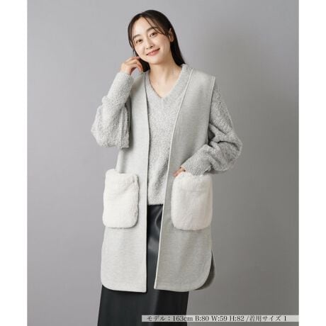 洗練されたデザインながらも大きなポケットがアクセントとなり、トレンド感のあるレイヤードスタイルが叶うベスト。ポケット部分には柔らかいフェイクファー素材が使われており、見た目にも温かみを感じさせます。どんなアイテムにも合わせやすく、上品で落ち着いた印象を演出します。コーディネートは、インナーにタートルネックを合わせたり、パンツスタイルで縦のラインを強調することで、スッキリとしたシルエットに仕上がります。シンプルなデザインだからこそ、アクセサリーや小物で個性をプラスしやすく、秋冬のデイリーに活躍します。フロントホックで開閉可能です。
