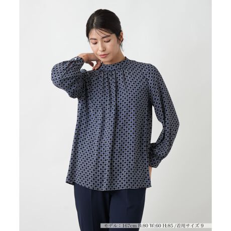 クラシカルな趣を感じさせる幾何学柄がポイントのスモックブラウス。シンプルながらも柄が生み出す存在感が、コーディネートに程よいアクセントを加えます。スタンドカラーは首元をすっきりと見せ、上品な印象をプラス。ゆとりを持たせたリラックス感あふれるシルエットでナチュラルに体型カバーを叶えつつ、心地よい着心地を実現。細身のパンツと合わせて大人スポーティな着こなしを楽しむのはもちろん、フレアスカートやプリーツスカートでまとめることで、よりフェミニンで柔らかなスタイルに。デイリーからちょっとしたお出かけまで幅広く活躍するアイテムです。バックファスナーにより開閉が可能。
