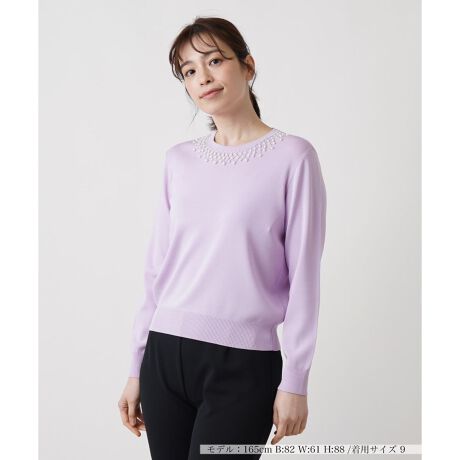 襟元に施された幾何学的なパール調ビジューの装飾が、アクセサリーなしでも顔周りをパッと明るく引き立てるニットトップス。ひと味違った存在感のあるデザインが程よい華やかさをプラス。柔らかな生地感で快適な着心地を実現し、長時間の着用でもストレスフリーで過ごせる一枚です。パンツやスカートと合わせるだけで、手軽にエレガントなスタイリングが完成するので、デイリーコーデから週末のお出かけ、特別な日のお呼ばれまで幅広いシーンで活躍してくれそうです。