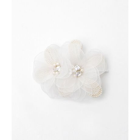 繊細なシフォン素材で作られた花びらに、きらめくビジューとパールがあしらわれ、高級感のある仕上がりです。
