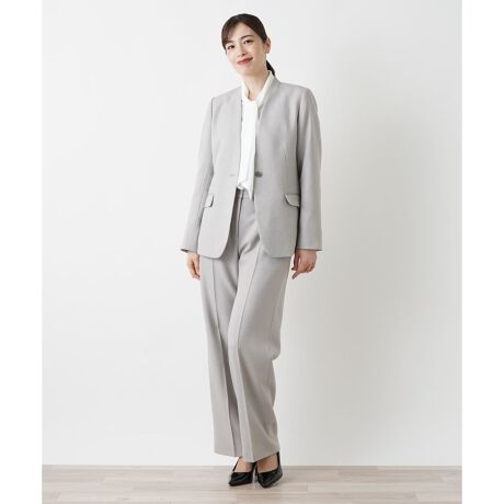 春夏らしい表面感とドライタッチな質感が特長の春夏らしいパンツスーツ。小さめの立ち襟と深めのVカラーがすっきり見えするジャケットは、気になる腰まわりをカバーする丈にしています。パンツはセンタープレス入りのきちんと感のあるシルエット。後ろウエストにゴムを入れ穿き心地の良いデザインです。