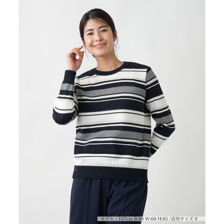 リズミカルなマルチボーダーが魅力的なクルーネックニットプルオーバー。視線を惹きつける印象的なデザインながらも、バランスの取れた配色が上品で洗練された表情を醸し出します。さらに透かし編みを巧みに取り入れたディテールが軽やかさをプラス。ネックラインは浅めに設定され、首元を上品にカバー。落ち着いた雰囲気をキープしながらも、さりげなく女性らしさを演出。程よいリラックス感があり、美しくフィットするシルエットも嬉しいポイントです。