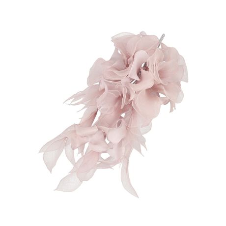 シルクオーガンジーやサテン素材を使用したフラワーモチーフのコサージュ。繊細で軽やかな素材がふわりとした立体感を生み出し、上品で優雅な雰囲気を演出。控えめながらも上品に輝くビジューをあしらい、さりげない華やかさをプラス。添えるだけでシンプルな装いにもエレガントなアクセントを加えてくれます。結婚式やパーティーなどの特別なシーンにふさわしく、定番のドレススタイルを一層引き立てる、洗練されたアクセサリーです。安全ピン留め。