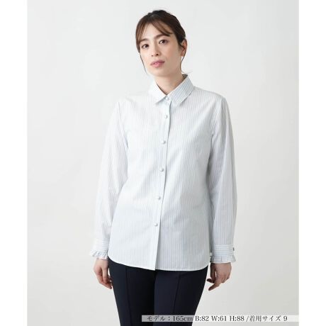 オルタネイトストライプがうっすらと浮かぶブラウス。コットンにセルロースをブレンドした薄手の生地を用い、軽やかで通気性がよく、爽やかな着心地を実現しています。パール調ビジューのデコラティブなボタンを採用し、さりげない華やかさをプラス。襟元や袖口の細部までこだわりが詰め込まれ、上品でエレガントな印象を与えます。パンツと合わせてスタイリッシュなオフィスコーデに仕上げたり、スカートと合わせてフェミニンなスタイリングを楽しんだりと、幅広い着こなしに対応する一枚です。