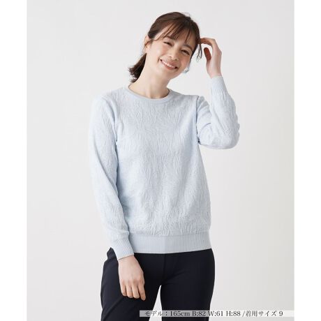 レースのような繊細なフラワー柄が女性らしい上品な印象を与えるカットソー。襟ぐりや袖口にはラメが煌めき、リュクス感を漂わせるエッセンスに。ロングスリーブながら程よい透け感があり、重たさを感じさせず、インナー次第でシーズンを通して活躍するアイテムです。多彩なボトムスと相性がよく、カジュアルなデニムと合わせて抜け感のあるコーディネートに仕上げたり、タイトスカートやスラックスでエレガントなスタイルを楽しむことも可能。