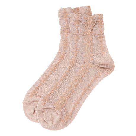 繊細な編地が生み出す独特のテクスチャーが魅力のショートソックス。ラメ糸を織り交ぜているため、上品な輝きを放ち、足元にさりげない華やかさをプラスします。派手になりすぎず程よいリュクス感を演出するデザインは、カジュアルからフェミニンなスタイルまで幅広くマッチ。フラットシューズやローファー、スニーカーと合わせても品よく馴染み、コーディネートをさりげなく格上げしてくれる一足です。