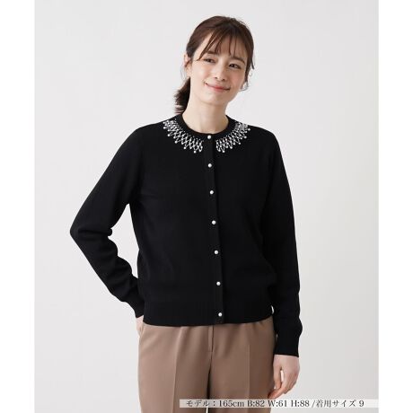襟元に施された幾何学的なパール調ビジューの装飾が、アクセサリーなしでも顔周りをパッと明るく引き立てるニットカーディガン。さらにパール調ボタンを用い、細部までこだわりを感じさせるデザインに。柔らかな生地感で快適な着心地を実現し、長時間の着用でもストレスフリーで過ごせる一枚です。パンツやスカートと合わせるだけで、手軽にエレガントなスタイリングが完成するので、デイリーコーデから週末のお出かけ、特別な日のお呼ばれまで幅広いシーンで活躍してくれそうです。