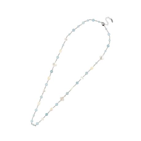 アクアマリンに蝶貝や真鍮を組み合わせた、繊細でありながら存在感のあるモチーフが魅力のロングネックレス。優しい輝きを放つアクアマリンが、穏やかで洗練された印象を与え、蝶貝の上品な光沢と真鍮の温かみのある質感も相俟って絶妙なハーモニーを奏でます。ナチュラルなテイストのチュニックやワンピースと好相性で、旬のフェミニンルックを格上げし、エレガントな雰囲気を演出します。