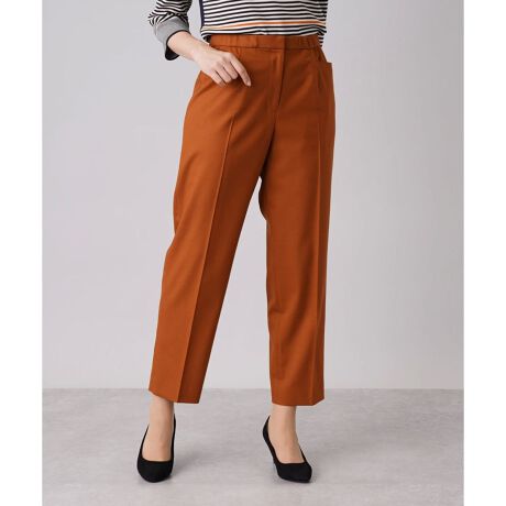 センタープレスが入ったきちんと感のあるテーパードパンツ。上品なツヤ感と適度なハリ感が特長の先染めツイル素材を使用しており、ストレッチが効いているので穿き心地も快適。腿周りにゆとりをもたせつつ、裾に向かって程よく絞り込んだシルエットが絶妙。綺麗なラインにこだわっているので、大人の女性らしいパンツスタイルにアップデートしてくれます。トレンドのグリーンのカラーパンツは秋のマストアイテム。