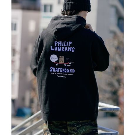 レギュラーとBIGの中間サイズの、リラックスFITシルエットのグラフィックプルパーカーです。