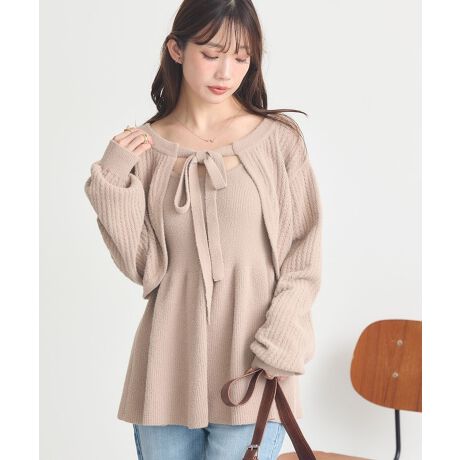 ふんわりタッチの弾力感あるニットで仕立てたフェミニンなセットアイテム。リボンアクセントがキュートなショートボレロにペプラムキャミソールを合わせた旬なデザインです。シェイプラインを際立たせる絶妙なボリュームトップでスタイルアップを後押し。ワントーンカラーながらも存在感のあるスタイリングにまとめてくれるおすすめのアイテムです。透け感[ややあり]