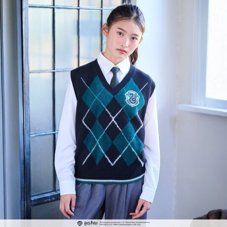 ベストには寮ごとのエンブレム刺しゅう入りで、アーガイル柄とラインで寮のイメージカラーを表現。