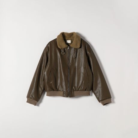 表面は柔らかくツヤ感のある合皮素材、裏面はふんわりとしたボアがアクセントになるショートブルゾン。