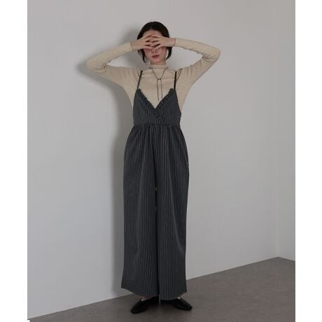 ピンストライプ柄でスタイリッシュな印象を与えるオールインワン。