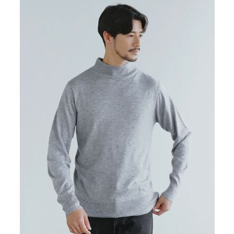目の細かい14Gのハイゲージの編み地とすっきりとしたサイジングが魅力のモックネックニット。