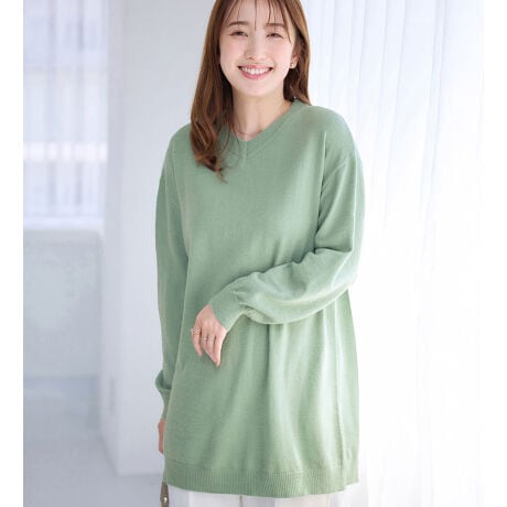 ・首元をすっきり見せるVネックデザインが、大人の抜け感を演出する。
