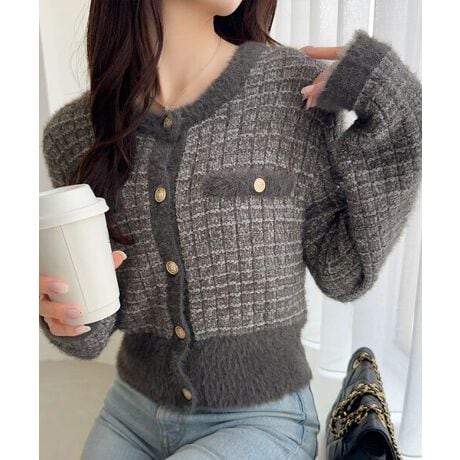 ツイード調に見える糸を使用したニットジャケット。フェザーヤーンをトリミングにあしらい、羽織るだけで華やかな印象を与える一枚。