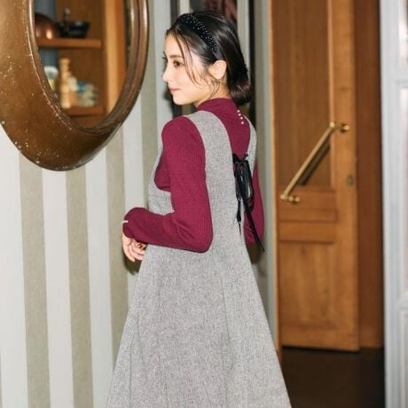 ツイード素材で上品に着ていただけるジャンスカです〇首元のVネックラインがすっきり見えにしてくれます。使いやすい2色展開で、インナーにカラーを合わせるなどのスタイリングもおすすめです!
