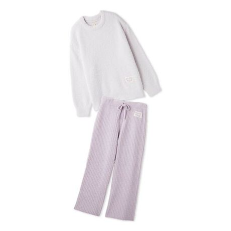 淡いカラーリングが可愛い‘パウダー’素材のプルオーバーと、やや濃い目カラーの‘ベビモコ’素材のリブロングパンツをセットにしました。プルオーバーは太めの袖が可愛いゆったりサイズ。パンツもはきやすいストレートシルエットで仕上げています。いずれも腰の位置にロゴ刺繍入りのワッペン付き。上下の素材感や肌触りの違いをお楽しみいただけるアイテムです。色はクリーム、ピンク、ラベンダー、ブルー、グレーの5色展開。HOMMEサイズとペア・コーディネートしたり、ギフトにもおすすめです。