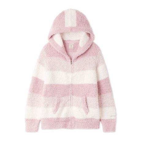 定番もこもこ素材‘ジェラート’を使用した、着こなしのアクセントになる3色ボーダーのシリーズです。左袖口にロゴ刺繍を入れたジップパーカは、1枚でも羽織りとしてもお楽しみいただけるアイテム。3色ボーダーのうち1色がメランジカラーになっているのがポイントで、ピンクとラベンダーはグラデーション調のカラーリング、ネイビーはメリハリのある配色デザインで仕上げました。同シリーズのボトムや小物を合わせたり、同時期に展開するモチーフ3柄ワッフルシリーズとのコーディネートしてお楽しみください。