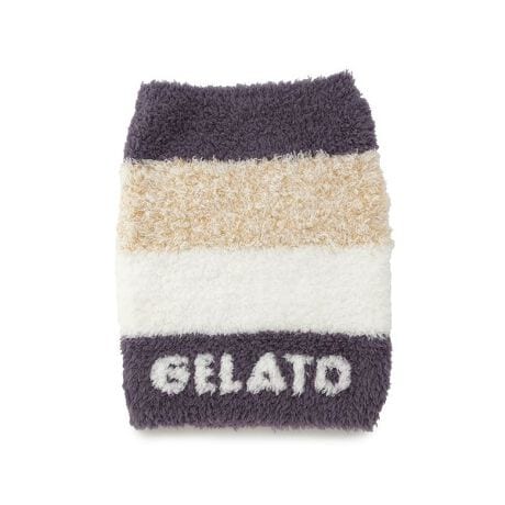 定番もこもこ素材‘ジェラート’を使用した、着こなしのアクセントになる3色ボーダーのシリーズです。ロゴジャガードがスタイリッシュなウエストウォーマーは、秋冬の温活に欠かせないアイテム。3色ボーダーのうち1色がメランジカラーになっているのがポイントで、ピンクとラベンダーはグラデーション調のカラーリング、ネイビーはメリハリのある配色デザインで仕上げました。同シリーズのルームウェアや小物を合わせたり、ギフトにもおすすめのアイテムです。