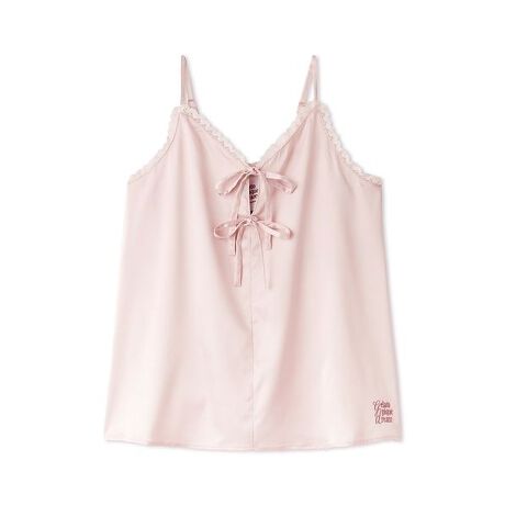 艶やかな光沢感がHOLIDAYの幸せな気分を盛り上げる、配色レース付きのサテンシリーズです。胸元にレース、フロントに華奢なリボンをデコレーションしたフェミニンな雰囲気のキャミソール。左裾にシリーズ共通の赤いロゴ刺繍が入っています。ストラップはアジャスター付き。色は品の良いオフホワイトと柔らかなピンクの2色展開です。同シリーズのロングパンツを合わせたり、同時期に展開するラメフェザーカーディガンを羽織るのもキュートです。