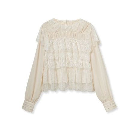 透け感のある楊柳シフォンに数種類のレースを組み合わせ、リュクスなムードに仕上げたフリルレースブラウス。ネックラインから肩にかけて繊細なフリルをあしらい、レースの柔らかな透明感が際立つロマンティックなデザインです。インスタイルでコンパクトにまとめても、アウトスタイルでふんわりと纏ってもバランスよく決まり、オンからオフまで幅広いシーンで活躍します。