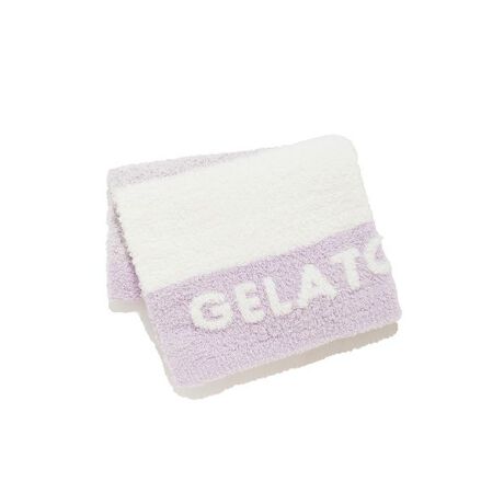 定番もこもこ素材‘ジェラート’を使用した、着こなしのアクセントになる3色ボーダーのシリーズです。ロゴジャガードがスタイリッシュなブランケット。膝掛けや子どもたちのお昼寝など様々なシーンに重宝する1枚です。3色ボーダーのうち1色がメランジカラーになっているのがポイントで、ピンクとラベンダーはグラデーション調のカラーリング、ネイビーはメリハリのある配色デザインで仕上げました。同シリーズのルームウェアや小物を合わせたり、ギフトにもおすすめのアイテムです。