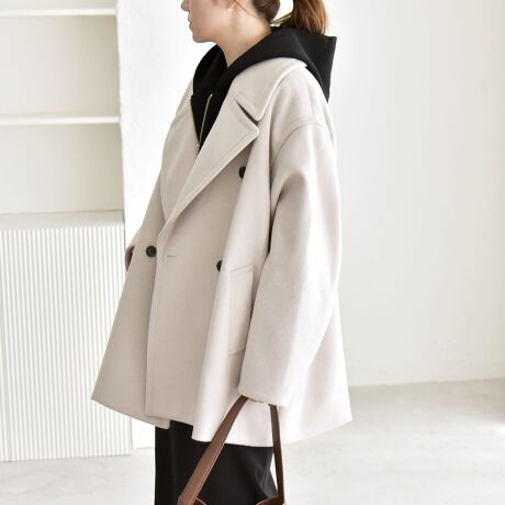 トラッドな印象のピーコートをベースにした、ダブル仕様のミディ丈コート。