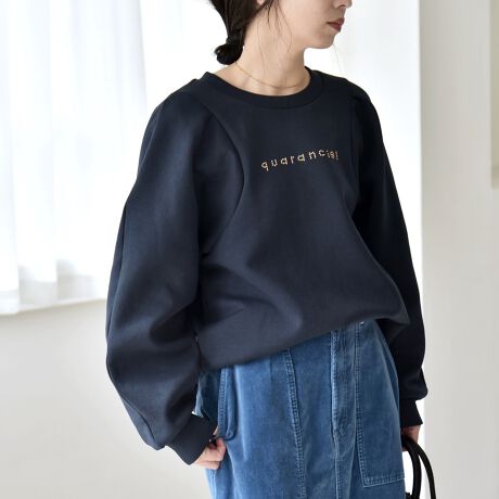 フロントのスタッズロゴがポイントのきれい見えスウェット。