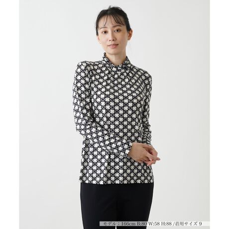 どこか懐かしさを感じさせる、レトロテイストの幾何学フラワー柄がお洒落な雰囲気を演出するハイネックカットソー。ネックラインにはドレープ感を作り、女性らしい柔らかなニュアンスに。すっきりとしたシルエットでボトムスともバランスよくコーディネートできる一枚。定番のベーシックな無地のパンツでまとめるのはもちろん、フェミニンなロングスカートを合わせたキレイめの着こなしもおすすめです。