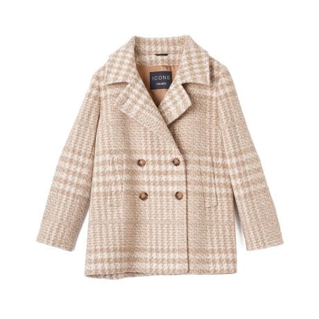 クラシカルな趣をまとった、チェック柄のダブルハーフコート。起毛感のあるやわらかな生地に落ち着いたトーンのチェック柄をのせて、どこか懐かしくも新鮮な佇まいに。ふっくらとした風合いが見た目にも暖かく、冬の装いにぬくもりを添えてくれる一着です。肩パットの留め付けが端正な佇まいを演出。フロントはダブルボタン仕様でトラッドなムードを引き立てます。スカートにもパンツにもバランスよく合わせられ、羽織るだけでスタイルが整います。