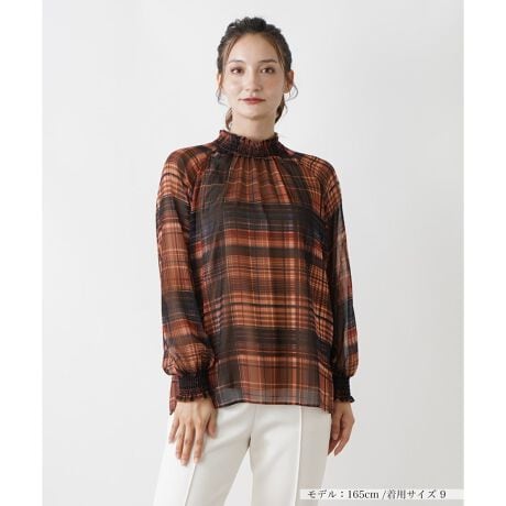 [型番:0404502]秋色カラーにシアーな素材感をプラスした、トレンドライクなブラウス。ギャザーでフリルの様なネックデザインが、愛らしい印象に。一枚でももちろん、アウター着用の時期にも存在感のあるトップスです。