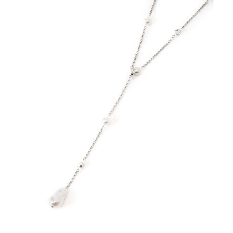 チェーンの上を転がるようなパール調パーツが、お顔周りを明るく彩るネックレス。さらに、雫のような一粒のパール調パーツが静かな輝きを放ち、スタイリングの魅力を高めてくれます。コーディネートに馴染む柔らかい輝きのパール調パーツは、シンプルなワンピースやトップスを優しく華やかな印象に変えます。