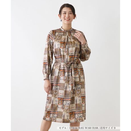 光沢のあるサテン地に馬具のモチーフがブロック柄で表現されている、イタリア製素材を使用した上品なプリントのワンピース。低めなスタンドカラーにタックで動きを出したデザインと、ボディラインを拾わない、程よく身から離れるシルエットがポイント。また付属の共布ベルトをすることでシルエットを変えてお召し頂けます。光沢がありシワになりにくいのが特長です。ベルトはタイとしても使用できるので気分に合わせてアレンジが可能です。
