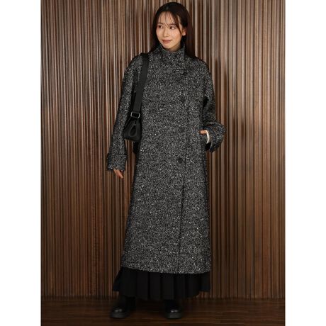 高めのスタンドカラーが目を引く、ユニセックス対応のロングコート。