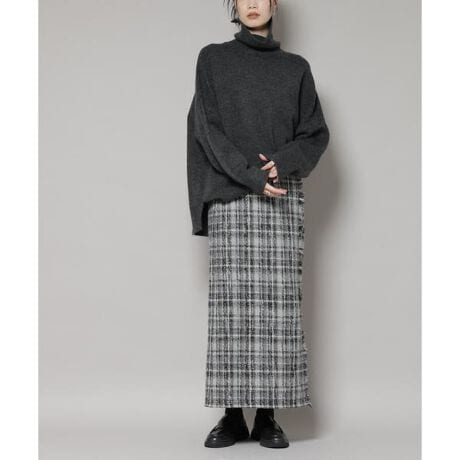 秋めくチェック柄が印象的なIラインスカート。縦に入ったフリンジがデザイン性とスタイルアップを実現。シンプルなトップスと合わせるだけでサマになる主役のデザインです。
