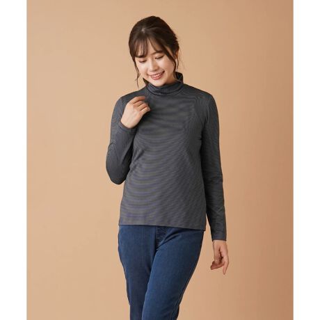 ストレッチの効いた滑らかな肌触りの生地が肌に優しく寄り添うハイネックカットソー。ナローボーダーがスタイリングのアクセントになり、独特の表情を生み出します。高さのあるネックが気になるデコルテを品よくカバー。すっきりと着こなせるのでコートやジャケットとのレイヤードスタイルにもオススメのアイテムです。