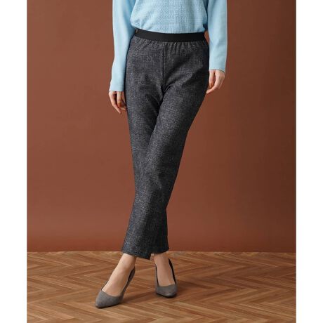 杢調の味わい深い表情の生地を使用した、すっきりとしたスリムシルエットのアンクルパンツ。生地は裏起毛素材で優しい温もりが感じられ、ストレッチが効いているので程よい伸縮性があり足捌きも良好。ウエストは総ゴム仕様とし、心地よいフィット感をもたせました。足元をさりげなく覗かせる丈感だから、パンプスを合わせてきれいめにまとめてみるのも素敵。
