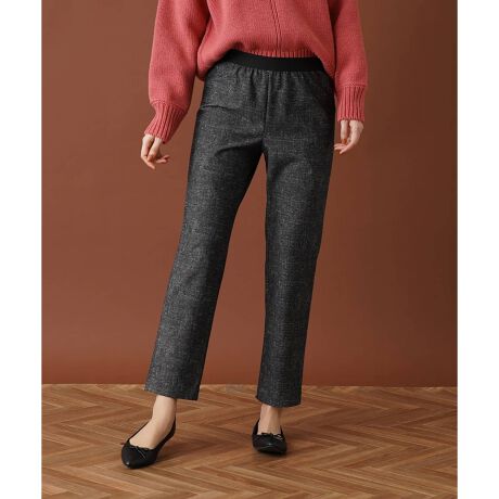 杢調の味わい深い表情の生地を使用した、すっきりとしたスリムシルエットのアンクルパンツ。生地は裏起毛素材で優しい温もりが感じられ、ストレッチが効いているので程よい伸縮性があり足捌きも良好。ウエストは総ゴム仕様とし、心地よいフィット感をもたせました。足元をさりげなく覗かせる丈感だから、パンプスを合わせてきれいめにまとめてみるのも素敵。