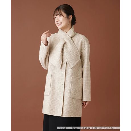 ハウンドトゥース柄とメランジ調のリバーシブルで着用できる、厚手のアルパカ混生地を使用したノーカラーコート。同素材のティペットがセットになっており、お好みに応じてアレンジして楽しめます。ドロップショルダーでシルエットに程よいリラックス感をもたせており、肩肘張らないストレスフリーの着心地を実現しています。フロントにマーブルボタンを採用し、細部までこだわりを感じさせるデザインに。オンオフを選ばず多彩なシーンで活躍するアウターです。
