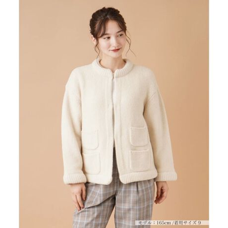 ドロップショルダーのリラックスシルエットでデザインしたノーカラーニットジャケット。ふっくらとした厚みのあるニットがシーズンらしい温もりを醸し出します。前ウエスト周りには四つのパッチポケットをリズミカルにレイアウトし、さりげない遊び心を演出。フロントは鍵ホック留めで仕上げ、すっきりとしたシンプルな印象に。カーディガンのような感覚で優しくふんわりと羽織ることもできるアウターです。