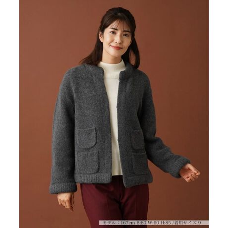ドロップショルダーのリラックスシルエットでデザインしたノーカラーニットジャケット。ふっくらとした厚みのあるニットがシーズンらしい温もりを醸し出します。前ウエスト周りには四つのパッチポケットをリズミカルにレイアウトし、さりげない遊び心を演出。フロントは鍵ホック留めで仕上げ、すっきりとしたシンプルな印象に。カーディガンのような感覚で優しくふんわりと羽織ることもできるアウターです。